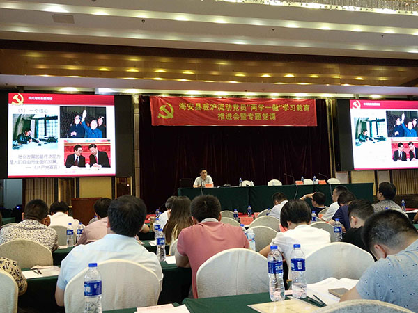 同時,根據(jù)縣委組織部對“兩學一做”教育活動的工作安排,“聯(lián)合黨委”于5月19日下午舉行“兩學一做”教育活動專題黨課?!奥?lián)合黨委”書記李忠澤作“兩學一做”動員報告,海安縣委黨校常務副校長徐進、副校長程衛(wèi)國分別作“學習黨章、學習系列講話”專題黨課,海安籍在滬流動黨員近400人參加活動。