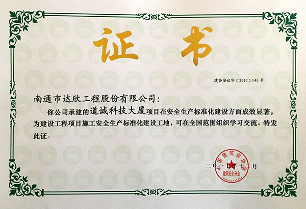 近幾年,我公司獲得全國(guó)AAA級(jí)安全文明標(biāo)準(zhǔn)化工地25項(xiàng),創(chuàng)建面涉及上海、江蘇、河北、黑龍江、湖南、新疆等市場(chǎng),榮譽(yù)的取得為進(jìn)一步提升“達(dá)欣”在全國(guó)各個(gè)市場(chǎng)的影響力,促進(jìn)企業(yè)健康發(fā)展奠定堅(jiān)實(shí)的品牌基礎(chǔ)。