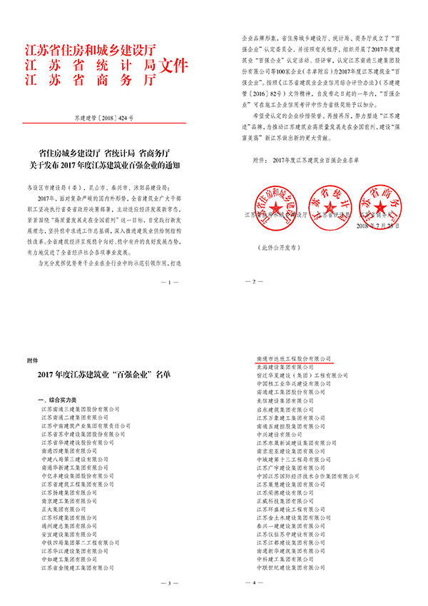 江蘇建筑業(yè)“百強企業(yè)”是由省建設(shè)廳、省統(tǒng)計局、省商務(wù)廳成立的“百強企業(yè)”認定委員會評議認定,從企業(yè)營業(yè)額等經(jīng)濟類指標、質(zhì)量安全、技術(shù)創(chuàng)新指標等方面進行綜合評定,旨在充分發(fā)揮優(yōu)勢企業(yè)在全行業(yè)中的引領(lǐng)和示范作用,打造建筑企業(yè)品牌,提升核心競爭力,是權(quán)威性的政府評選。同時按照《江蘇省建筑業(yè)企業(yè)信用綜合評價辦法》(蘇建建管〔2016〕82號)文件精神,自發(fā)布之日起的一年內(nèi),“百強企業(yè)”可在施工企業(yè)信用考評中作為省級獎勵予以加分。