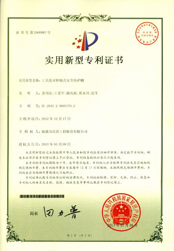 成果二提出了一種建筑施工現(xiàn)場用工具化可伸縮式的安全防護棚,將防護棚由通常的整體式結構改成單元式、定型化、工具式結構,可根據場地需要組合成多種尺寸,且所有構件單元可重復周轉使用,整體安裝方便快捷,從而提高各類安全防護棚的安裝速度和安全性,能較好的滿足施工現(xiàn)場的標準化、規(guī)范化、安全文明施工的要求,推進了科技進步。