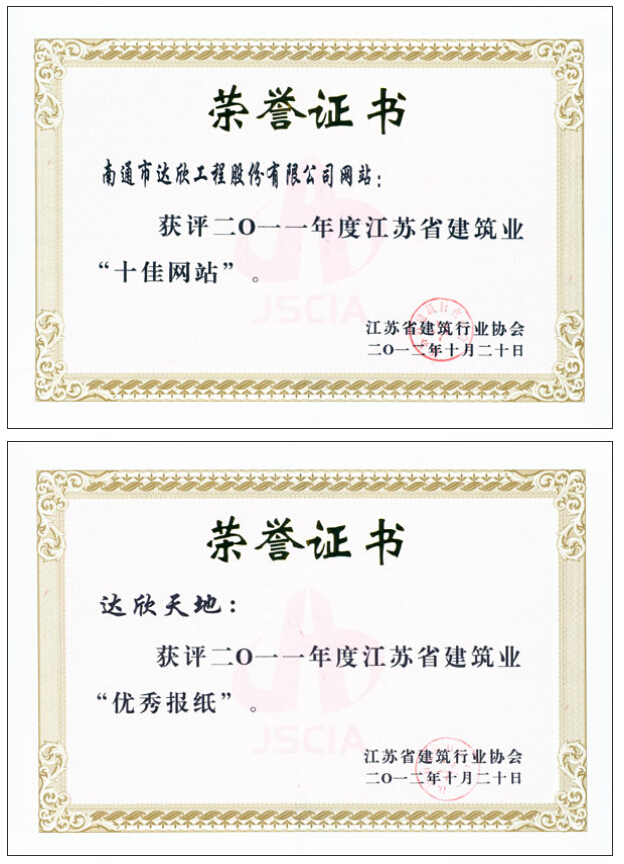 會議同時對2011年度江蘇省建筑業(yè)優(yōu)秀報、刊、網(wǎng)和優(yōu)秀通訊員進(jìn)行了表彰,南通市達(dá)欣工程股份有限公司網(wǎng)站榮獲江蘇省建筑業(yè)“十佳網(wǎng)站”、“達(dá)欣天地”報榮獲江蘇省建筑業(yè)“優(yōu)秀報紙”。