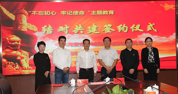 集團(tuán)黨委根據(jù)“不忘初心  牢記使命”主題教育的部署,10月12日在集團(tuán)總部與海安市中城街道海陵社區(qū)黨總支完成結(jié)對(duì)共建簽約儀式。中城街道新陵辦事處黨委書(shū)記周海冰、政工書(shū)記唐濤、海陵社區(qū)黨總支書(shū)記劉海燕、集團(tuán)黨委書(shū)記劉厚純、黨委宣傳委員杭小建等出席簽約儀式。