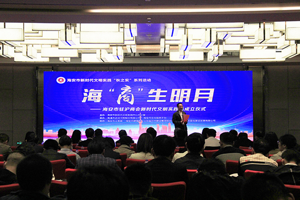 10月29日,海安市駐滬新時(shí)代文明實(shí)踐站成立儀式在上海舉行。江蘇省住建廳駐上海辦事處主任、江蘇省人民政府駐上海辦事處建管處處長(zhǎng)趙永強(qiáng),南通市文明辦副主任吳信林;海安市委副書(shū)記、黨校校長(zhǎng)張浩,海安市委常委、宣傳部長(zhǎng)王榮貴,海安市人民政府副市長(zhǎng)戴曉晨,以及上海海安商會(huì)全體會(huì)員,海安駐滬流動(dòng)黨員聯(lián)合黨委全體班子成員,海安駐滬建筑企業(yè)負(fù)責(zé)人,各區(qū)鎮(zhèn)街道政工書(shū)記、宣傳委員、駐滬招商人員等200多人出席活動(dòng)現(xiàn)場(chǎng)。