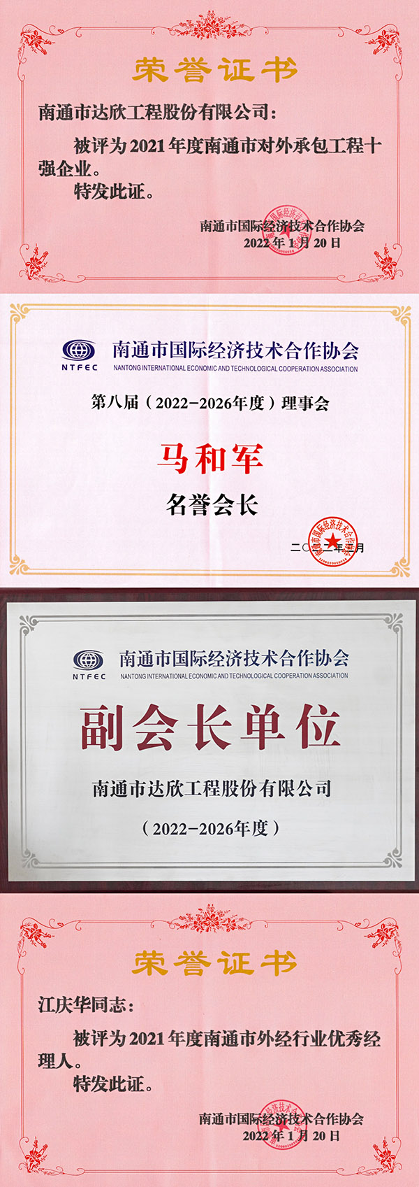 會上,達欣集團被評為2021年度南通市對外承包工程十強企業(yè),董事長馬和軍當選第八屆(2022-2026年度)理事會名譽會長,企業(yè)當選為副會長單位,柬埔寨分公司江慶華被評為南通市外經(jīng)行業(yè)優(yōu)秀經(jīng)理人。