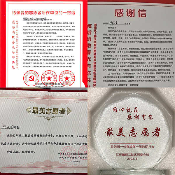 近日,公司陸續(xù)收到來(lái)自中共上海市虹口區(qū)四川北路街道工作委員會(huì)、街道辦事處、新冠疫情防控工作領(lǐng)導(dǎo)小組對(duì)集團(tuán)第一工程公司廣大職工、第八工程公司劉旭,以及中共嘉定區(qū)江橋鎮(zhèn)綠二社區(qū)對(duì)第八工程公司倪慶龍,在上海疫情期間,積極投身社區(qū)疫情防控志愿服務(wù),不懼風(fēng)雨、不辭辛苦,始終堅(jiān)守助力打贏上海疫情阻擊戰(zhàn)的基層戰(zhàn)場(chǎng),所展現(xiàn)出的大愛(ài)、擔(dān)當(dāng)、奉獻(xiàn)精神,表示感謝和慰問(wèn)。倪慶龍獲得“最美志愿者”稱號(hào)。