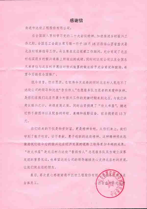 元月9日,公司收到來(lái)自山西省壺關(guān)縣北莊村村委會(huì)黨支部寄來(lái)的錦旗和感謝信,對(duì)集團(tuán)在助力北莊村鄉(xiāng)村建設(shè)、鄉(xiāng)村振興、鄉(xiāng)村致富等方面所給予的關(guān)愛(ài)和扶持表示感謝。