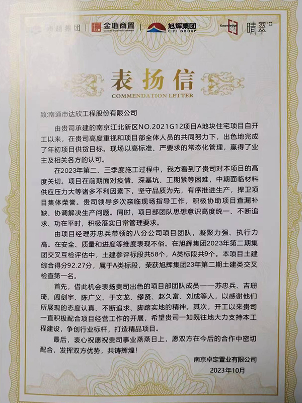 近日,公司收到南京卓定置業(yè)有限公司發(fā)來的表揚(yáng)信,對公司南京G12項(xiàng)目管理團(tuán)隊(duì)出色完成年初項(xiàng)目預(yù)期目標(biāo),以及在項(xiàng)目建設(shè)中表現(xiàn)出的專業(yè)、認(rèn)真、負(fù)責(zé)的態(tài)度,不畏困難、迎難而上的精神,高標(biāo)準(zhǔn)、嚴(yán)要求的工作作風(fēng)提出贊揚(yáng)和認(rèn)可。此外,該項(xiàng)目在旭輝集團(tuán)2023年第二期土建類檢查中榮獲第一名的好成績。