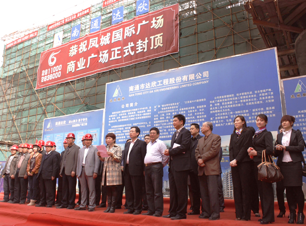 在4月15日的裙樓封頂儀式上,唐山天壤房地產(chǎn)開發(fā)有限公司闞春鳳董事長首先向全體參建人員表示衷心的感謝,對達(dá)欣公司在工程建設(shè)中所做的努力給予高度評價和充分肯定,她在最后致詞中堅信:在達(dá)欣股份等諸多品牌公司的通力協(xié)作之下,在全體參建人員的共同努力下,鳳城國際廣場項(xiàng)目一定會如期完成。