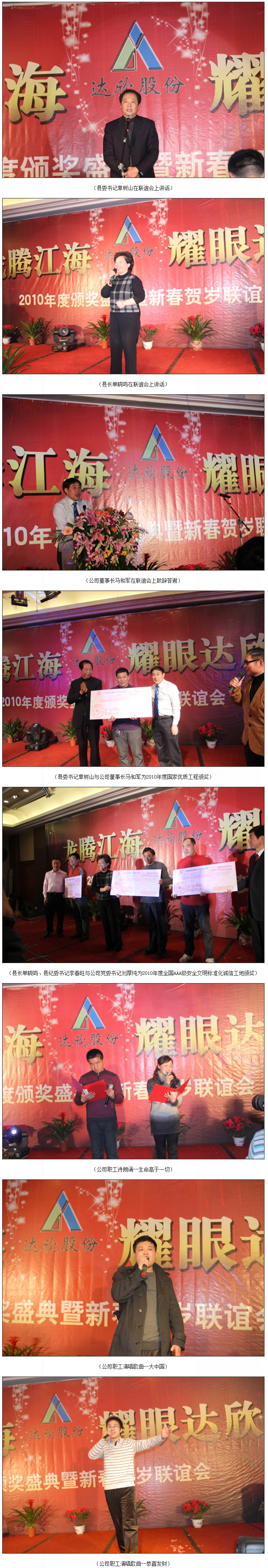 在喜慶樂典和主持人高亢激昂的道白后,首先回睦了2010年公司精彩的展示專題片,公司董事長馬和軍隨后進(jìn)行了致辭答謝。他回顧了公司一年來所取得的輝煌成績,感謝社會各界及公司全體同仁們的努力,并對公司的未來發(fā)展之路描繪了藍(lán)圖;接著,縣委書記章樹山發(fā)表重要講話,他指出,建筑業(yè)是我縣的傳統(tǒng)產(chǎn)業(yè),也是一個富民強(qiáng)勢產(chǎn)業(yè),還是我縣財政收入的重要來源之一,作為縣內(nèi)的骨干企業(yè),達(dá)欣公司步入了公司歷史以來發(fā)展最快、榮譽(yù)最高、分配最多、貢獻(xiàn)最大的時期,他希望公司要加快發(fā)展,高起點(diǎn)定位,突出重點(diǎn),好中求快,實現(xiàn)達(dá)欣新飛躍。