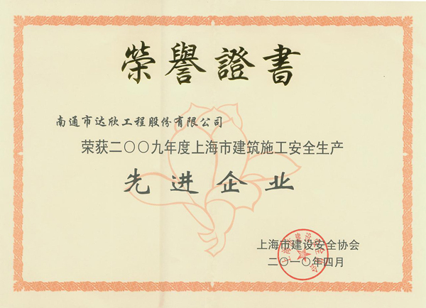 上海分公司作為江蘇省建管局駐滬辦推薦的四家企業(yè)之一,日前被上海市建設(shè)安全協(xié)會評為2009年上海市建筑施工安全生產(chǎn)先進企業(yè)。