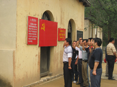 石家莊黨支部的同志們來到決定中國命運的七屆二中全會舊址,在鮮紅的黨旗前,由分公司副經理徐興義同志帶領大家重溫了入黨誓詞。
