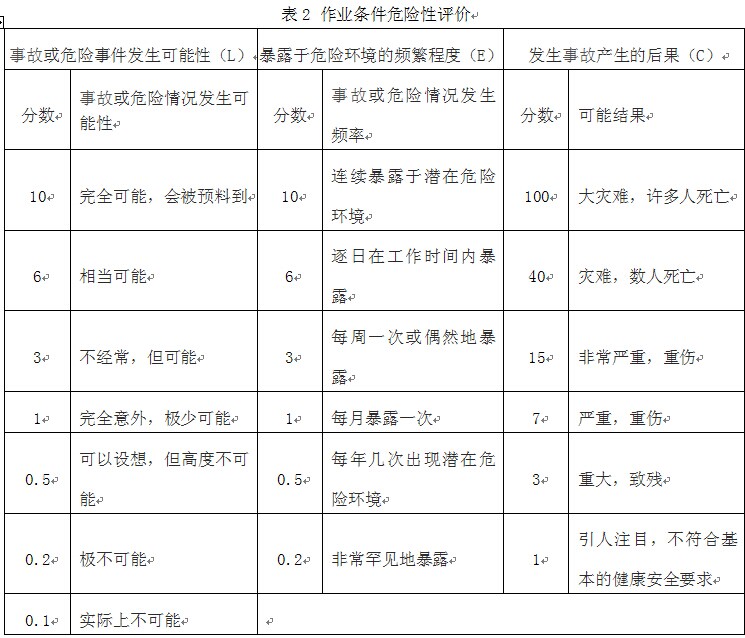 風險等級評估通常采用“作業(yè)條件危險性評價法”,根據(jù)事故發(fā)生的可能性、暴露于危險環(huán)境的頻繁程度和事故發(fā)生后的后果嚴重程度進行綜合評分,來確定風險等級,如表2。