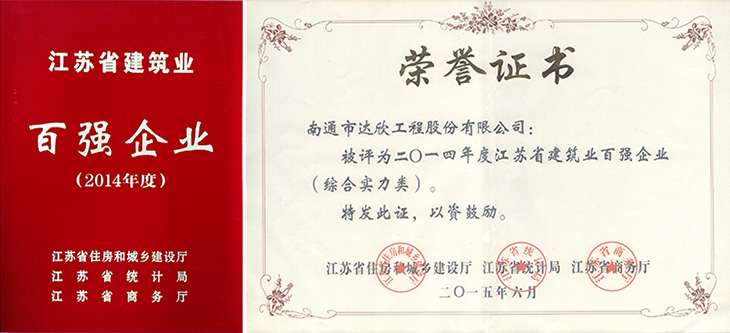為充分發(fā)揮優(yōu)勢企業(yè)在全行業(yè)中的引領和示范作用,打造建筑企業(yè)品牌,提升核心競爭力,省住房城鄉(xiāng)建設廳、統(tǒng)計局、商務廳成立了“百強企業(yè)”認定委員會,本著“尊重事實、嚴格標準、規(guī)范程序、公平公正”的原則,組織開展了2014年度建筑業(yè)“百強企業(yè)”(企業(yè)包括總承包綜合實力類、建筑裝飾裝修類、建筑鋼結構類、建筑安裝類、基礎設施類等)認定工作。經(jīng)評議,公司首度榮登2014年江蘇省建筑業(yè)“百強企業(yè)”。按照《江蘇省建筑業(yè)企業(yè)信用綜合評價辦法》(蘇建建管〔2013〕602號)文件精神,自發(fā)布之日起的一年內(nèi),“百強企業(yè)”可在施工企業(yè)信用考評中做為省級獎項予以加分。